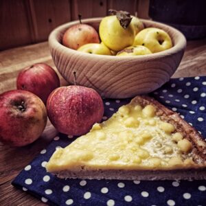 Koláč je posypaný máslovou drobenkou a přelitý polevou z rumu,vanilky a přepuštěného másla.