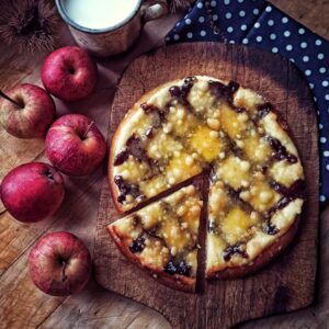 Koláč je posypaný máslovou drobenkou a přelitý polevou z rumu,vanilky a přepuštěného másla.